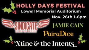 November 26: Holly Days Festival featuring Sindicate, Jamie Cain, Pairadice, Xtine & The Intents; Lowell Memorial Auditorium; 1:00 p.m. to 6:00 p.m.