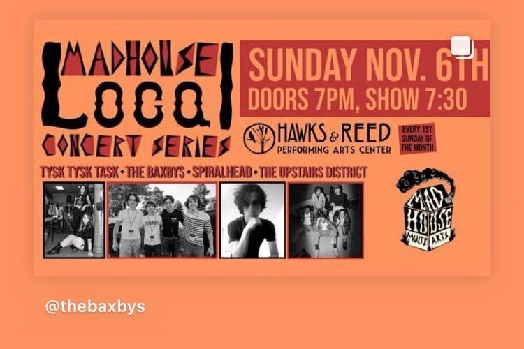 November 6: Tysk Tysk Tsyk The Baxbys, Spiralhead, The Upstairs District; Hawks and Reed; Greenfield, Massachusetts.