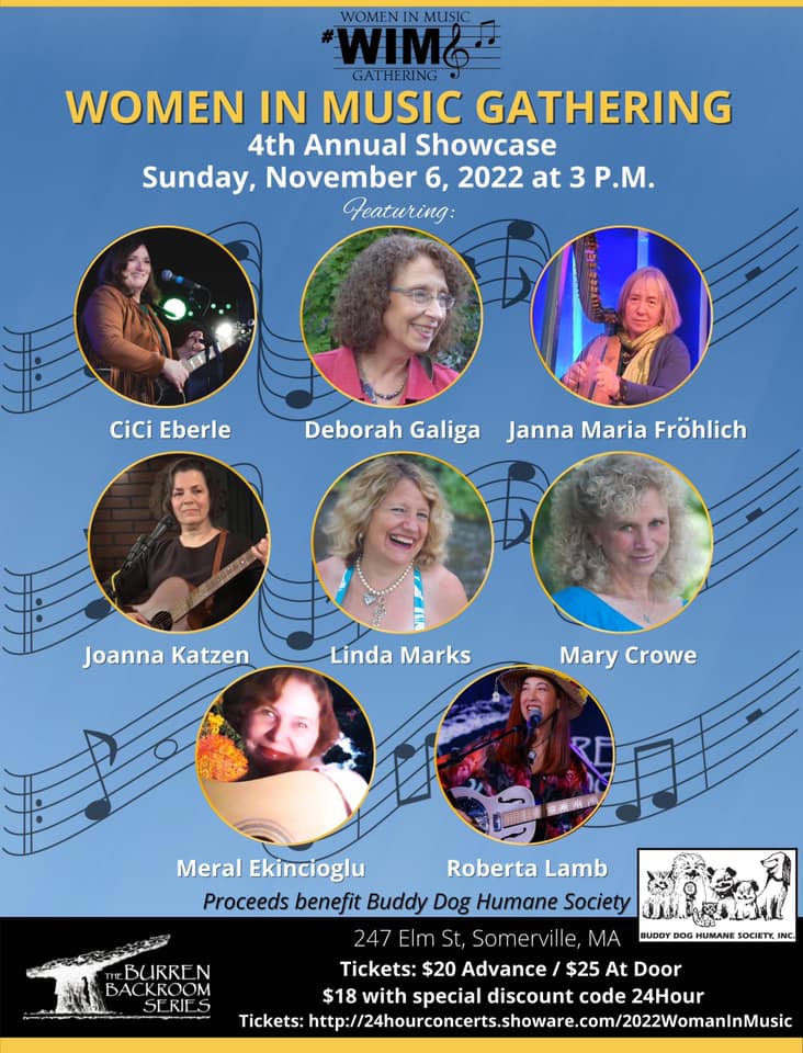 November 6: Women In Music Gathering #WIMG 4th Annual Showcase (benefit concert for Buddy Dog Humane Society) featuring Linda Marks, CiCi Eberle, Janna Maria Fröhlich, Joanna Katzen, Mary Crowe, Dahlia Gardner(Deborah Galiga), Mea Williams, Roberta Lamb ;The Burren, Somerville Massachusetts. 3:00 p.m.