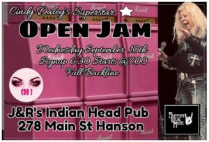 September 10: Cindy Daly Band; J & R’s Indian Head Pub; 278 Main Street, Hanson, Massachusetts. 7:00 pm