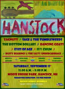 September 13: Sage And The Tumbleweeds Zagnutt, Dancing Goats Band, The Bottom Dollars, Eyes Of Age, Ivy Chum, Rusty Bearings & The Salty Undercarriage; Hanstock VII; Hancock Depot Center; Moose Brook Park; 40 Bennington Rd, Hancock, NH 03449, United States 111:00 am to 8:00 pm