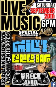 September 20: Emily’s Garage Band; The Wreck Yard 322 Lakeside Avenue, Laconia, New Hampshire. 6:00 pm