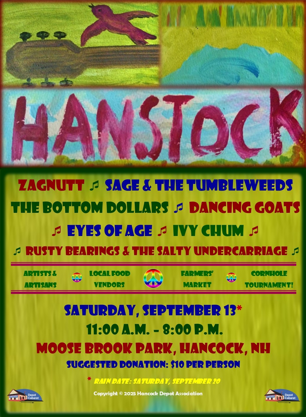 September 13: Sage And The Tumbleweeds Zagnutt, Dancing Goats Band, The Bottom Dollars, Eyes Of Age, Ivy Chum, Rusty Bearings & The Salty Undercarriage; Hanstock VII; Hancock Depot Center; Moose Brook Park; 40 Bennington Rd, Hancock, NH 03449, United States 111:00 am to 8:00 pm