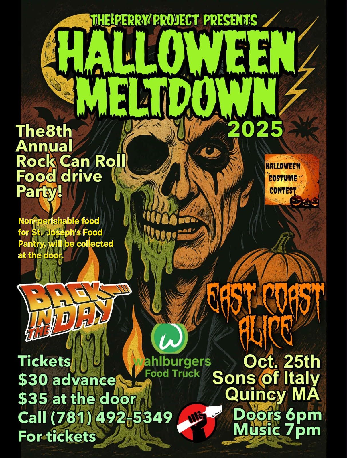 Halloween Meltdown featuring East Coast Alice and Back In The Day begins at 7;00 pm with doors opening at 6:00 pm. Tickets are $30 in advance and $35 at the door. Nonperishable food for St. Joseph’s Food Pantry will be collected at the door. Sons Of Italy 120 Quarry Street, Quincy, Massachusetts.