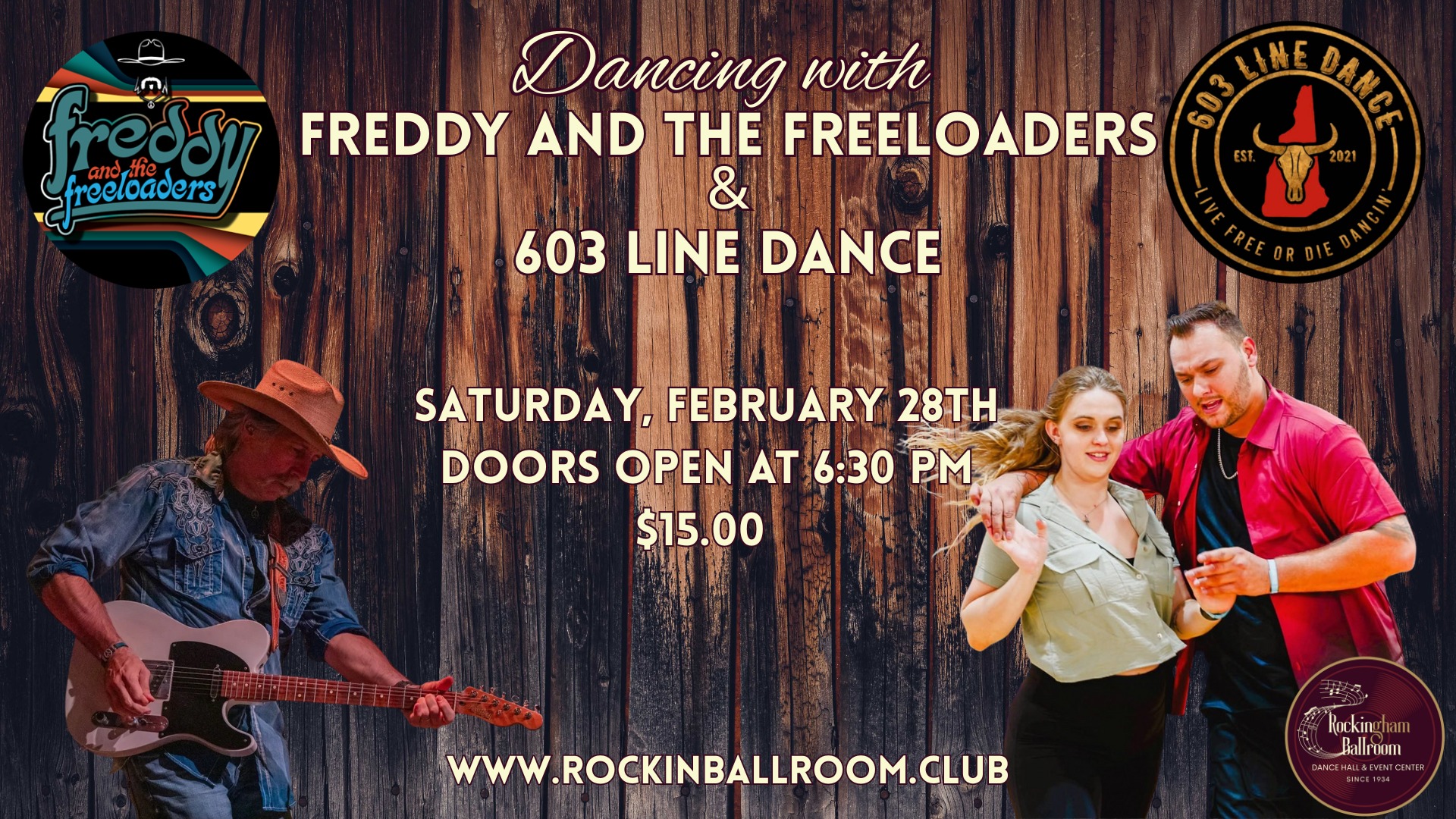 February 28: Freddie And The Freeloaders with 603 Line Dance; Rockingham Ballroom; New Market, New Hampshire. 7:00 pm doors 6:30 pm $15. Dancing with Freddy and the Freeloaders & 603 Line Dance | Facebook