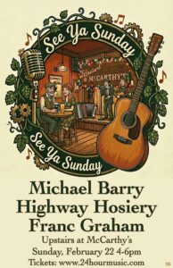 Feb 21: “See Ya Sunday” a new Sunday music series at McCarthy’s Toad Full food and drink menu. Me (with Dan Griffin, Elizabeth Steen & John Fremer III) plus Highway Hosiery (Steen & Jude Heichelbech) plus Franc Graham (w/ Chris Rival.) Use code 24HOUR for discount. 4:00 pm to 6:00 pm doors 3:30 pm